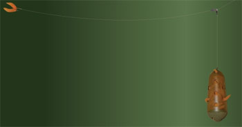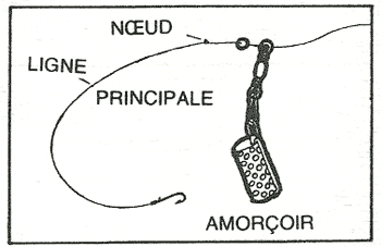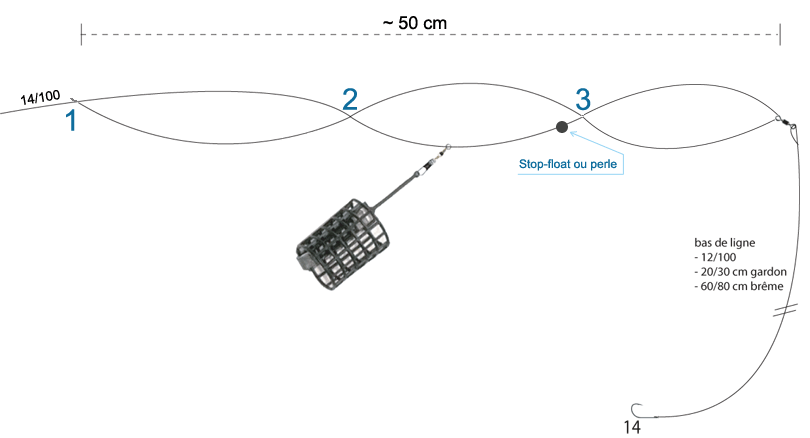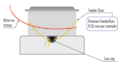 Ici, le method feeder est monté en direct sur le fil du moulinet -montage coulissant- ou via un élastique intérieur -montage amortisseur-, ce qui recentre les masses lors du lancer assurant ainsi une trajectoire presque rectiligne.